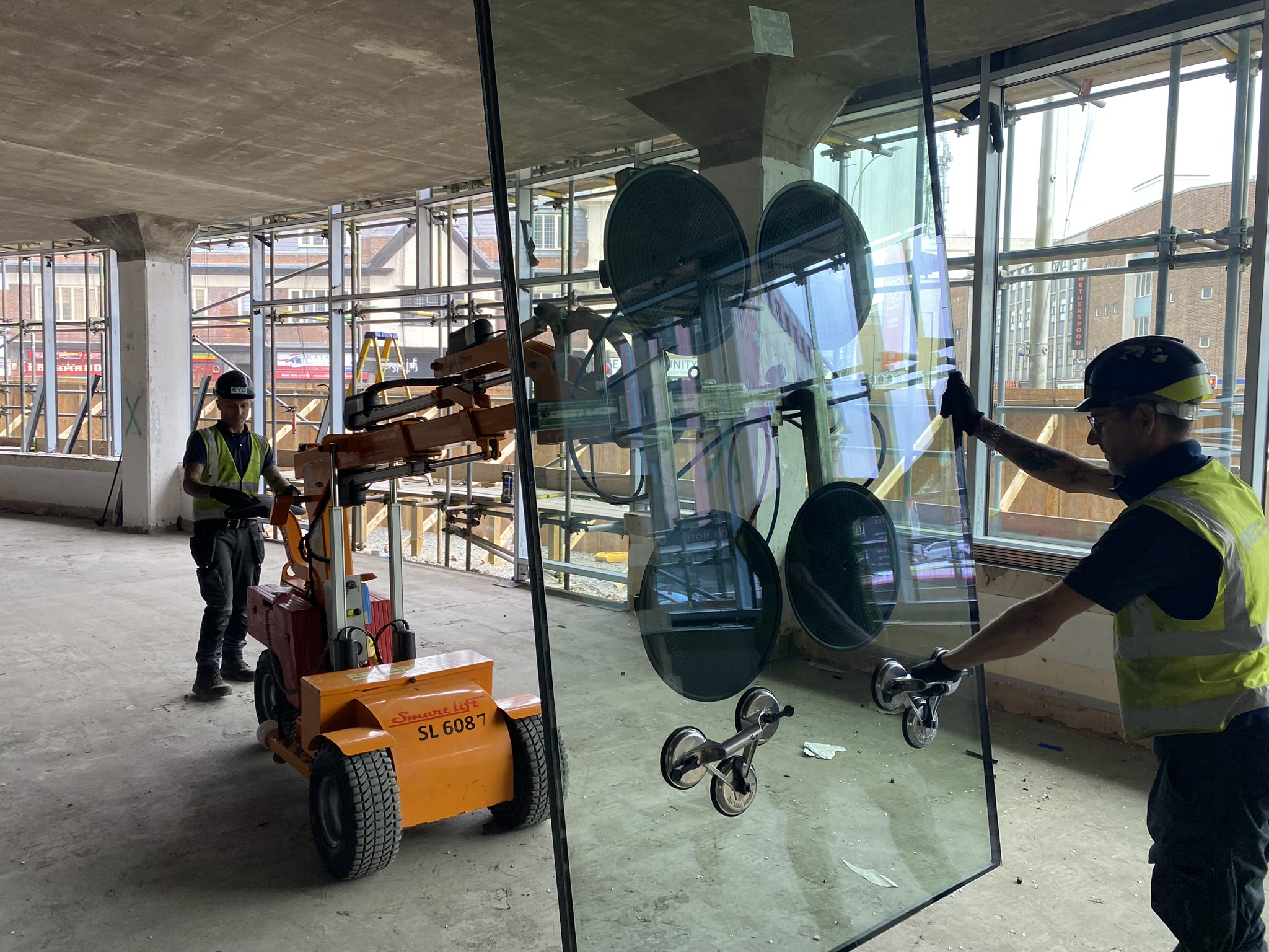 “With limited space outside due to scaffolding, each glazing unit had to be picked up by a specialist glazing robot from inside the building, lifted through the widow spacing at an angle and then pulled back into the glazing rebate and fitted.”